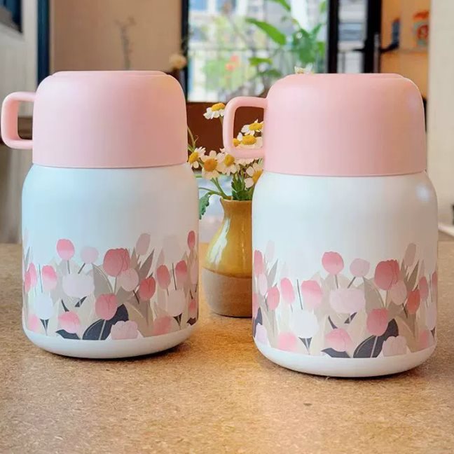 กระปุกอาหารเก็บอุณหภูมิ (Food Flask) รุ่นนี้เป็นของพรีเมียมที่มีดีไซน์น่ารักและใช้งานได้จริง เหมาะสำหรับมอบเป็นของขวัญสำหรับคนรักสุขภาพ หรือกลุ่มคนวัยทำงานที่ต้องการพกพาอาหารเช้าหรืออาหารว่างไปทานนอกบ้าน ตัวกระปุกมีรูปทรงมนน่ารัก พร้อมลายพิมพ์ดอกทิวลิปหรือดอกซากุระสีชมพูอ่อนโยน ซึ่งช่วยสร้างความรู้สึกอ่อนหวานและโรแมนติก การออกแบบที่เน้นความสวยงามนี้ ทำให้กระปุกอาหารนี้เป็นมากกว่าภาชนะ แต่เป็นไอเท็มที่น่าพกพาไปอวดในที่ทำงานหรือในคาเฟ่