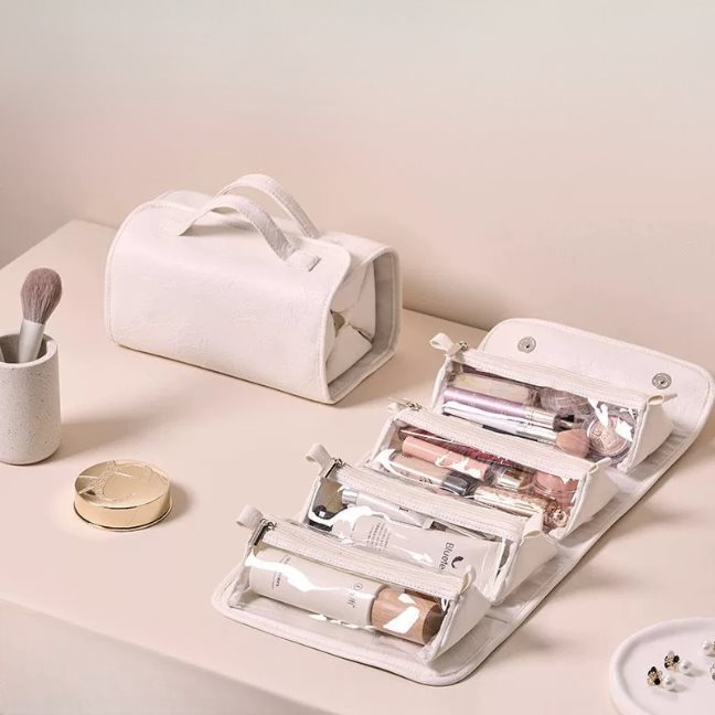 กระเป๋าจัดเก็บอุปกรณ์อาบน้ำและเครื่องสำอางแบบพับได้ดีไซน์หรูใบนี้ ออกแบบมาเพื่อตอบโจทย์นักเดินทางที่ต้องการความสะดวกสบายและความเป็นระเบียบในการจัดสัมภาระ ด้วยโครงสร้างภายในที่แบ่งช่องเก็บของแบบใสพร้อมซิปปิดมิดชิดหลายช่อง ช่วยให้สามารถแยกประเภทของเหลว สกินแคร์ และอุปกรณ์แต่งหน้าได้อย่างเป็นสัดส่วน ป้องกันการหกเลอะเทอะและมองเห็นสิ่งของได้ง่าย มาพร้อมฟังก์ชันตะขอแขวนในตัวที่ช่วยให้ใช้งานในห้องน้ำโรงแรมหรือที่พักได้ทันทีโดยไม่ต้องวางเกะกะพื้นที่หน้ากระจก