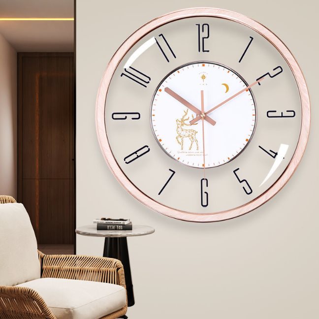 นาฬิกาแขวนผนังรุ่นนี้ออกแบบอย่างพิถีพิถัน ด้วยกรอบสีโรสโกลด์เงางามและตัวเลขดีไซน์ทันสมัย มาพร้อมลวดลายกวางบนหน้าปัดที่เพิ่มความมีชีวิตชีวาให้กับพื้นที่ตกแต่ง ตัวเรือนผลิตจากวัสดุคุณภาพดี ทนทานต่อการใช้งาน นาฬิกาเดินเรียบไร้เสียงรบกวน เหมาะสำหรับติดตั้งในห้องนั่งเล่น ห้องทำงาน หรือห้องนอน ช่วยเติมเต็มบรรยากาศให้ดูอบอุ่นและมีสไตล์ยิ่งขึ้น