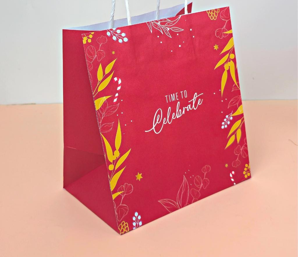 ถุงใส่ขนม ถุงใส่ของ บรรจุภัณฑ์ ถุงกระดาษหูเกลียว ลาย Time to celebrate 19x13x21 ซม.